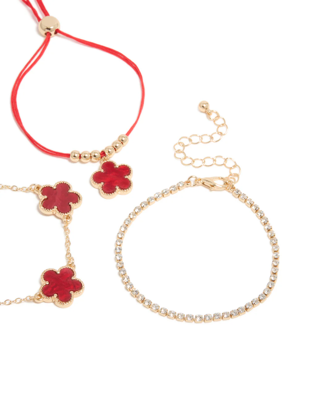 Gold Cubic Zirconia Tennis & Red Cord Flower Bracelets 3-Pack
