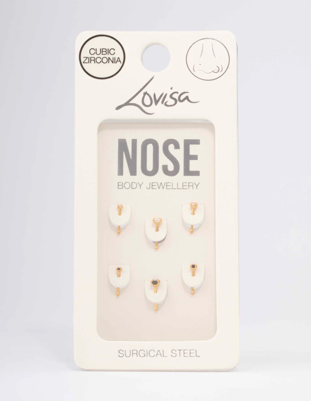This pack of gold plated, surgical steel nose studs are embellished with black and crystal diamantes for added drama.