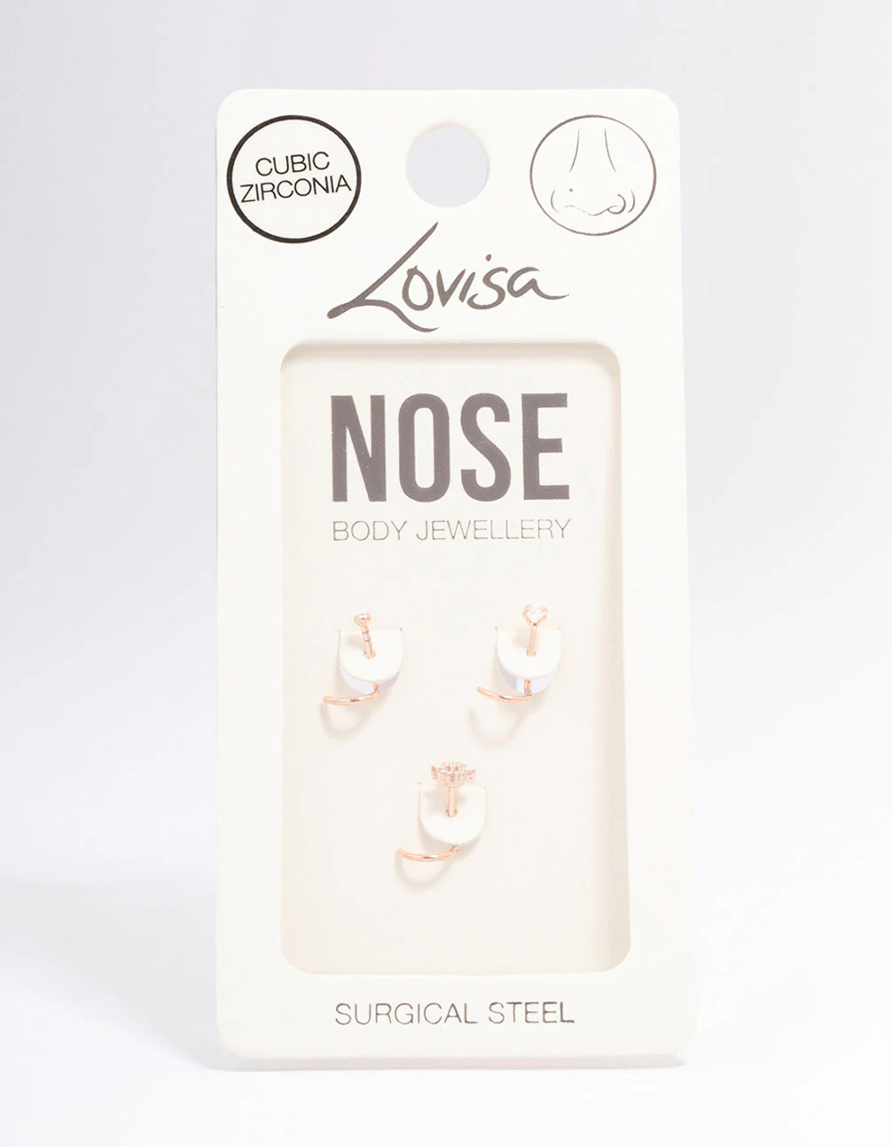 This nose piercing pack features three corkscrew nose studs, plated with real rose gold for a luxe finish.